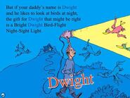 Dwight is a man from Oh Say Can You Say? He likes to look at birds outside his house during the nighttime so he obtains a Christmas gift from his unseen child that would help watch the birds at night. It's a Bright Dwight Bird-Flight Night-Sight Light.