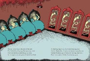 There are 5 or more Hinkle-Horn Honkers who are sleeping in their bed at night. Their horns are hanging on a hook in its own private Hinkle-Horn Nook with names on the top such as Freddy, George, and Henry. the other names have been cut from the page of the book.