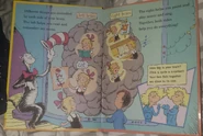 Once they are inside the machine, they see an x-ray image of the brain on a screen with Sally's head. The Cat in the Hat discusses the functions of the brain while they move onto a bigger screen that shows a top view of the brain, the two halves of the brain labelled "left brain" and "right brain." they are accompanied by illustrations of each part of the brain's primary responsibilities. Thing One and Thing Two demonstrate the size of the brain in a small illustration in the corner of the page.