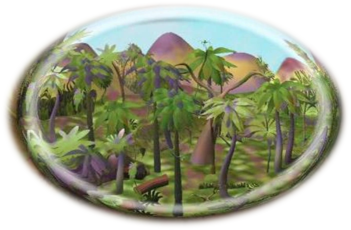 Terrain includes a pool of water. Nearby is a mountain range and beyond that a field of pink-flowering clover a hundred miles wide.