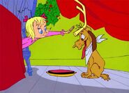 In the television special, Max's appearance has slightly changed, mainly in his face. He was voiced by Dallas McKennon, then by Henry Gibson, and now by Frank Welker (narrator of "Max's Playhouse" DVD segment "The Care and Feeding of a Grinch"). His only two speaking lines are "Yipe!" and "Raaaahhh!" performed by Dallas McKennon while being hit by the Grinch's whip. He has brown curved ears and tan fur.