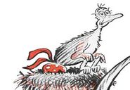 After about a week or two of sitting on her egg, Mayzie relied and persuaded Horton to sit on her egg for a few hours, while she actually flew to Palm Beach on her vacation and decided to never go back until Horton was done. Many months later when Horton was sold to the circus, causing him to arrive at Palm Beach and Mayzie saw the show, bumping into Horton in the process. When the egg is about to hatch, she demanded the egg back without offering Horton a reward. The bird soon hatches and is a cross between Mayzie and Horton, who is rewarded for his hard work by keeping the "elephant bird" and Mayzie is punished for her laziness by getting nothing. As she pouts on the side, a man who came in the tent with the others spots her for an unknown reason as the others are being entertained by the new discovery of the elephant bird.