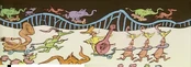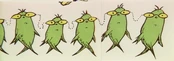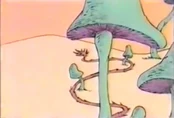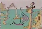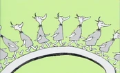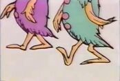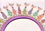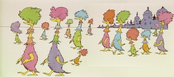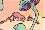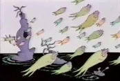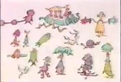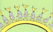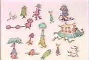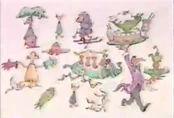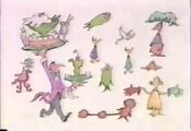 - Due to one of the 8th standing green fish with glasses being cut from the page there was only 7 of them and not 8. The brown creature who isn't a snail but has a snail's shell on her back is closer to the big orange animal (with a fish king on his back and a yellow pink haired puppy) in the video and is not in the corner like she was in the book and the mouse holding a green key is under the big animals right hand and the big animal's feet were drawn in due to being cut from the page and the man driving a blue one wheeled vehicle is a bit more closer to the big animal.