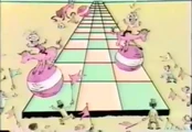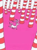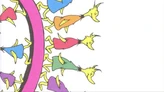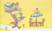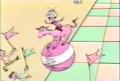 - On page 28-29 of the video of this book, the yellow and blue race track appears in 4 pieces coming together, Then the crowd cheering appears, and the three contestants appear with their horses on a ball the the 3 fishes appear lastly in three separate fish bowls. The boy who seems to have won the race resembles the boy from the book There's a Wocket in my Pocket! due to having on a red shirt with black stripes red pants with black stripes and red and black shoes. He the boy on the ball who won the race is leaning from left to right trying to keep his balance.