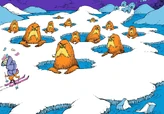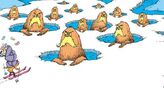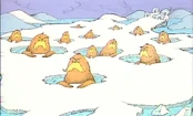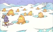 - On page 26-27 of the video of this book you will see 11 holes in the ice and some ice igloo homes somewhere in the middle. Then the angry concerned orange seals with mustaches appear few by few, they seem to resemble the Lorax but are more bigger then he is. Peter the Postman then slides in but is more closer to the first seal rather than being far like how he was in the book. The seals don't seem to like him or know who he is.