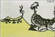 - Kay on page 59 isn't seen and is cut from the video as it was zoomed in, but the red ring she was holding behind Jay is shown. Jay's arm rotates up as he throws the yellow ring to the Gack's antlers and the ring lands on the part of the antlers where is was seen in the book being thrown to, then Jay and Kay from page 31 is used again but more closer to the Gack and Kay's head is flipped from the left facing right looking at the Gack.