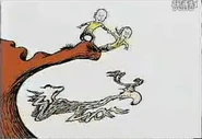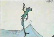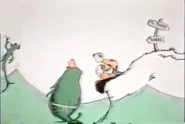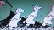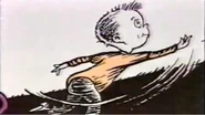 - On page 10-11, the second running creature's bottom and left leg is drawn in due to being cut from the page in the book. They appear to have shrunken a bit or either the sun is raised up. The third running creature isn't shown in the video due to being cut from the page of the book so there was only two running creatures being seen. The umbrella that Jay is holding is shaded in yellow a bit.
