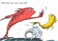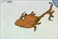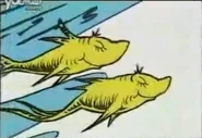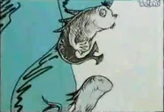 - In page 4 of the video of the book the first fish is placed on the left and not the right from where he was normally placed in on the book. The water on page one of the video seems to have been redrawn and colored. You will see the One fish who is now colored yellow and red from being all white on the cover of the book. The two green fishes appear the same. Due to the red fish's tail being cut from the page, the editors used the red fish from the cover of the book to be put into this page of the video. The blue fish is standing in another spot.