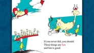 - On a blank page of this book before page 3, you will see a strange star bellied creature discussing the quote "From there to here, from here to there, funny things are everywhere." He was not used to be in the beginner book video.