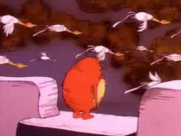 After the Lorax attempts to float the Once-ler down the river and then saves his life upon realizing there was a waterfall, the animals and the Lorax find one of the Once-ler's socks and come to return it to him, but he's asleep so they watch him as they think he looks cute and then they fall asleep. When they wake up, a Swomee-Swan lays an egg in the Once-ler's bowl, which he finds disgusting.
