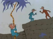 The next scene (of which Grandfather backtracked a few steps) has him approaching Van Itch. He is trembling at the very tall slingshot. Van Itch withdraws while Grandfather continues his patrol.